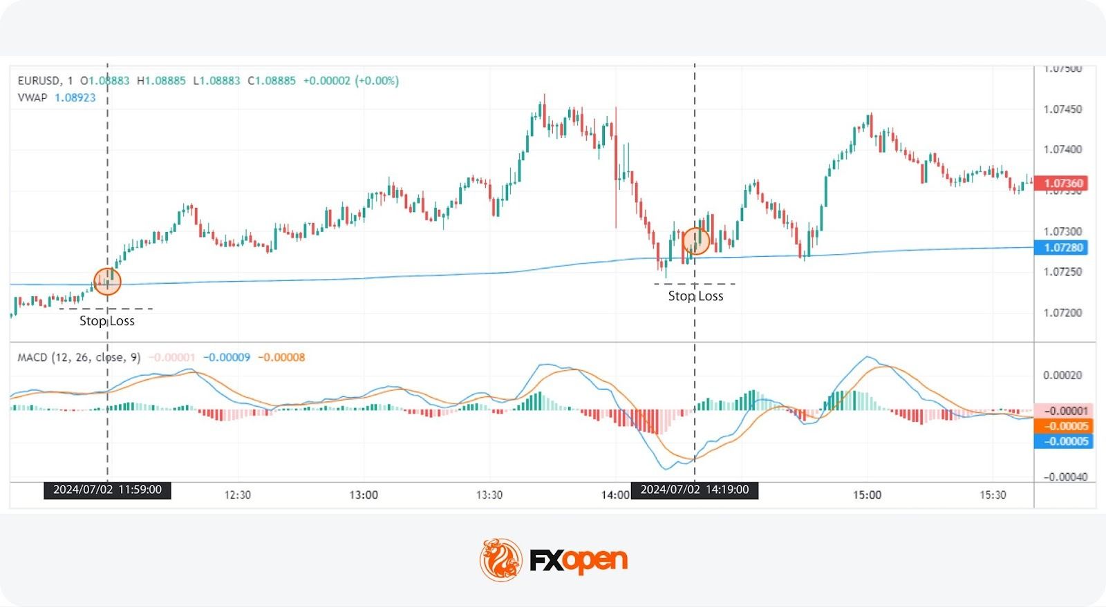 - Alternatively, another common entry point is when the price uses the VWAP as a level of support or resistance, confirmed by the MACD turning from positive to negative or vice versa.