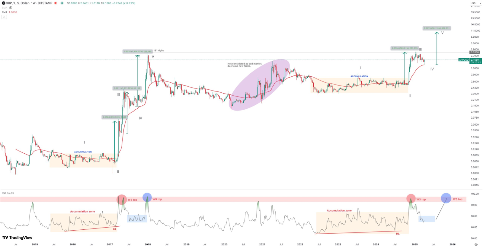 XRP’s recent rebound has prompted a widely followed analyst by the name Maelius to predict a $10 price target for the Ripple-related token based on the Elliott Wave Theory on the weekly time frame chart.