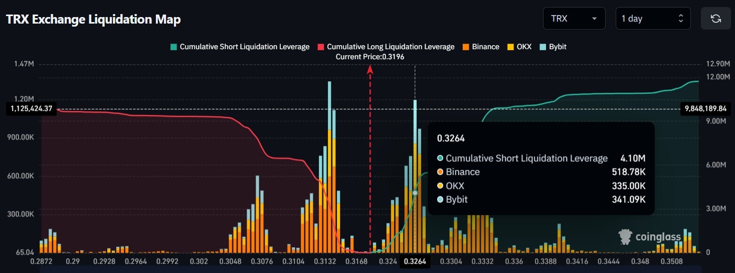 At press time, the major liquidation level on the lower side is $0.3136, where traders have built $3.25 million worth of long positions.