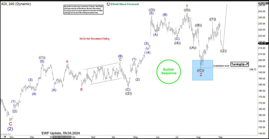 On the daily chart, the stock completed wave ((4)) of I in October 2022 and then rallied above the wave ((3)) high, confirming the progress of wave ((5)) of I. After completing waves (1) and (2) of ((5)), wave (3) is currently emerging from the October 2023 low of 154.99. In the minor degree, the price has completed waves 1 and 2 of (3) and is now in wave 3 of (5). A break above the top of wave 1 would confirm wave 3 if the current dip holds above 153.99. Therefore, the right trade plan is to wait for pullbacks in 3, 7, or 11 swings to buy from. At Elliottwave-Forecast, we provide the blue box on our chart where traders can find LONG and SHORT entries. The H4 chart below shows one such blue box on ADI as of August 5th, 2024.