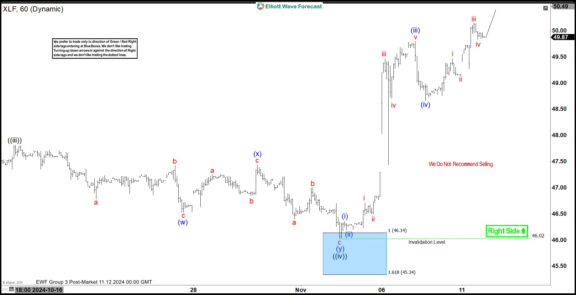 Here’s the 1-hour Elliott wave chart of XLF from the 10.31.2024 Midday update. In which, the short-term cycle from the 9.25.2024 low ended in wave ((iii)) as impulse at $47.81 high. Down from there, the ETF made a pullback in wave ((iv)) to correct that cycle. The internals of that pullback unfolded as Elliott wave double three structure where wave (w) ended at $46.52 low. Wave (x) bounce ended at $47.43 high and wave (y) managed to reach the blue box area at $46.14- $45.34. From there, buyers were expected to appear looking for the next leg higher or for a 3 wave bounce minimum.