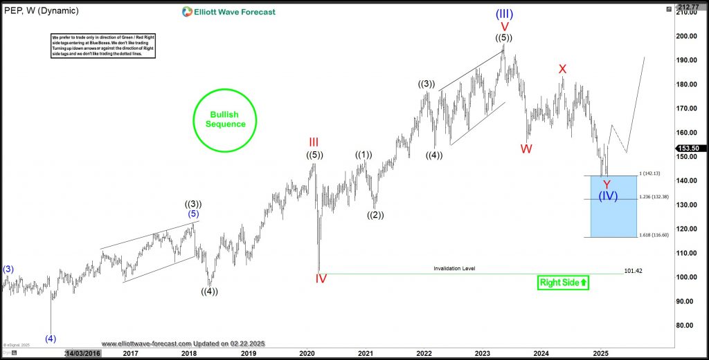 Despite the sell-off from May 2023, the PepsiCo stock remains within the all-time bullish cycle. Many times, within the bullish sequence, the price pulls back to give buyers the opportunity to buy lower and sell higher for profit. That appears to be the case for $PEP. The decline from May 2025 marked the wave (IV) of the supercycle degree within the bullish cycle from the all-time low. On 16th February 2025, we shared an article titled ”PepsiCo May End The Bearish Cycle From 2023 Soon”. In the article, we used the chart below to identify the extreme area for wave (IV). The blue box on our charts show members where to buy within a bullish sequence and where to sell within a bearish sequence.