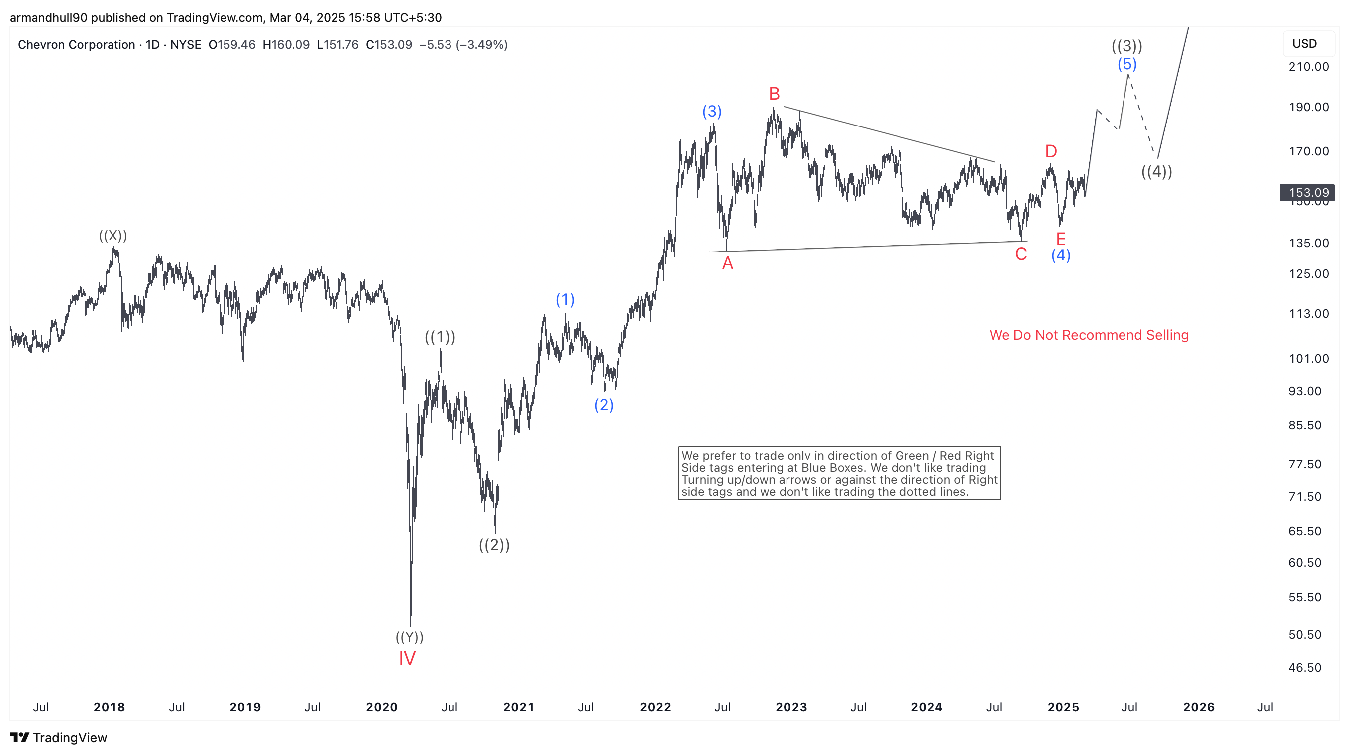 On the daily timeframe, Chevron (CVX) seems to have completed a corrective pattern. The structure forms a contracting triangle in Wave (4), labeled A-B-C-D-E. This suggests the correction is over, setting the stage for a bullish breakout. The projected path indicates CVX is starting a new impulsive wave higher. This aligns with the broader Elliott Wave count.