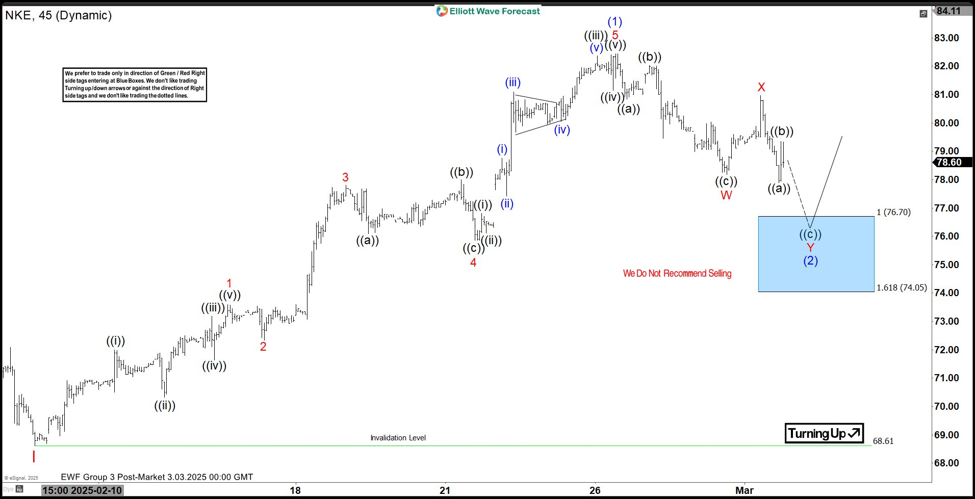 The update, from March 10, 2025, shows that $NKE reacted as predicted. After the decline from the recent peak, the stock found support in the equal legs area, leading to a bounce. As a result, traders could adjust to go risk-free.