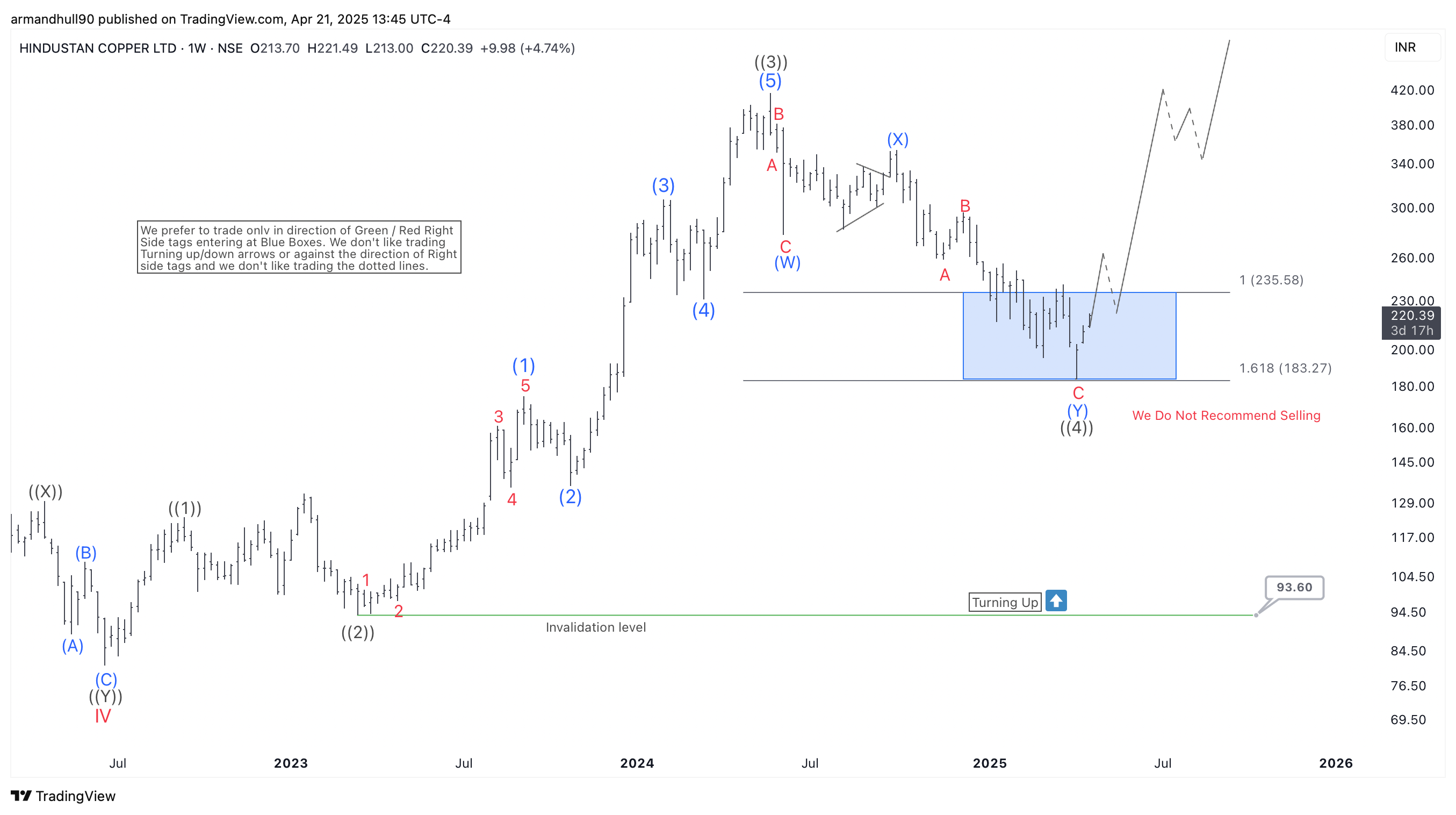 From the 2022 lows, HINDCOPPER advanced in a clear five-wave impulsive structure, culminating in a peak near ₹353.60. This rally marked the end of wave ((3)). What followed was a typical WXY double correction pattern in wave ((4)). This correction retraced deep into the Fibonacci zone between the 100% and 161.8% extension, marked as the Blue Box.