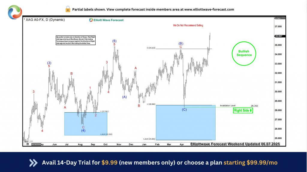 On 5th April, 2025, we shared the daily chart below with members. The chart shows the blue box zone where we recommended members to buy Silver with stop slightly below the box. In addition, we discussed the setup in the live sessions and technical videos.