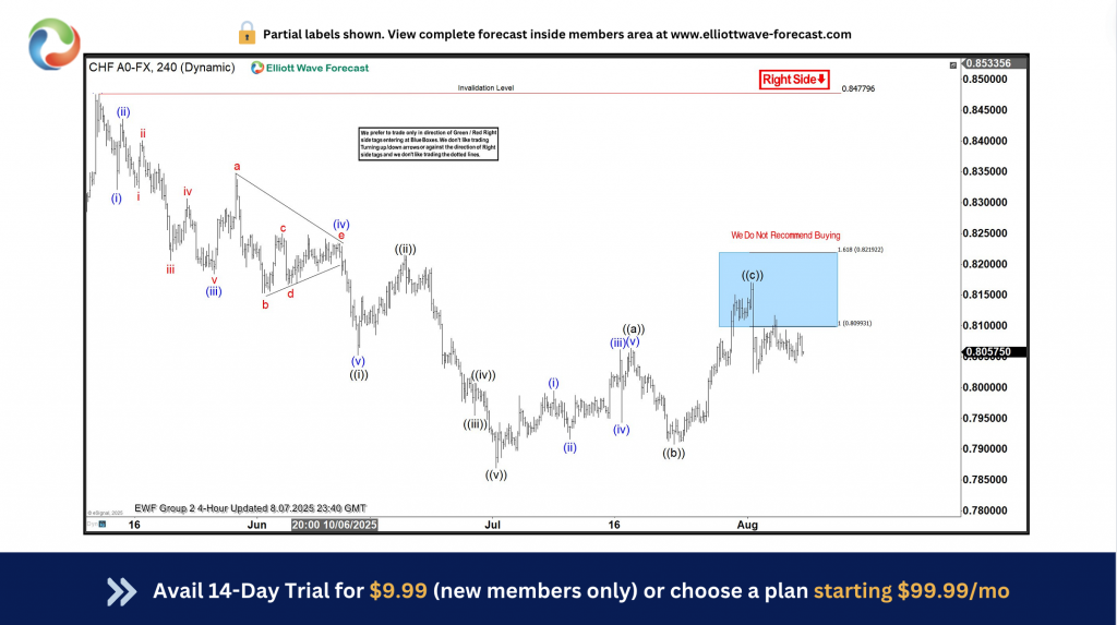 On 07.29.2025, we shared the H4 chart above with ElliottWave-Forecast members, highlighting a sell setup from the blue box. We use the blue box to mark the extreme zone of bounces in a bearish sequence and pullbacks in a bullish sequence. At the blue box range of 0.8100–0.8220, we expected members to go short and take partial profits at 50% of wave (c) of ((y)).