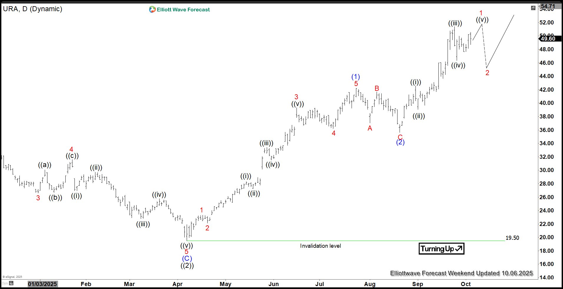 The daily chart of the $URA ETF above shows rally from wave ((2)) low on April 7, 2025 low is unfolding as an impulsive structure. Up from there, wave (1) ended at $42.22 and pullback in wave (2) ended at $35.64. As far as pivot at $19.5 low is holding, expect the ETF to extend higher.