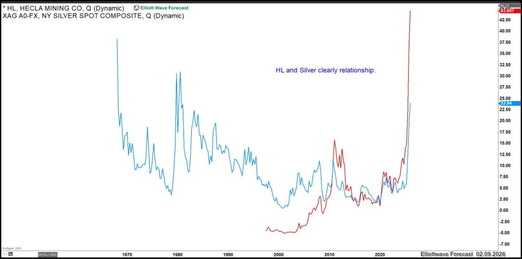 Here is a chart showing the correclation between $XAGUSD (Silver) and HL (Hecla Mining Corporation).