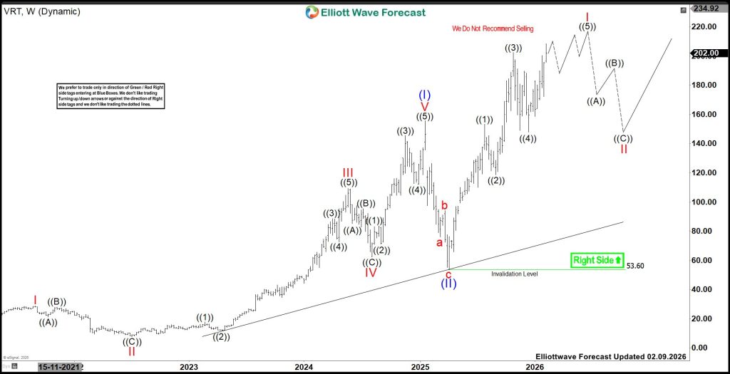 VRT favors bullish sequence in weekly & favors rally within April-2025 sequence. It favors rally in ((5)) to end the diagonal Elliott Wave in I, while above 12.17.2026 low. It favors rally into $215.5 – $232.1 area to end I before correcting next.