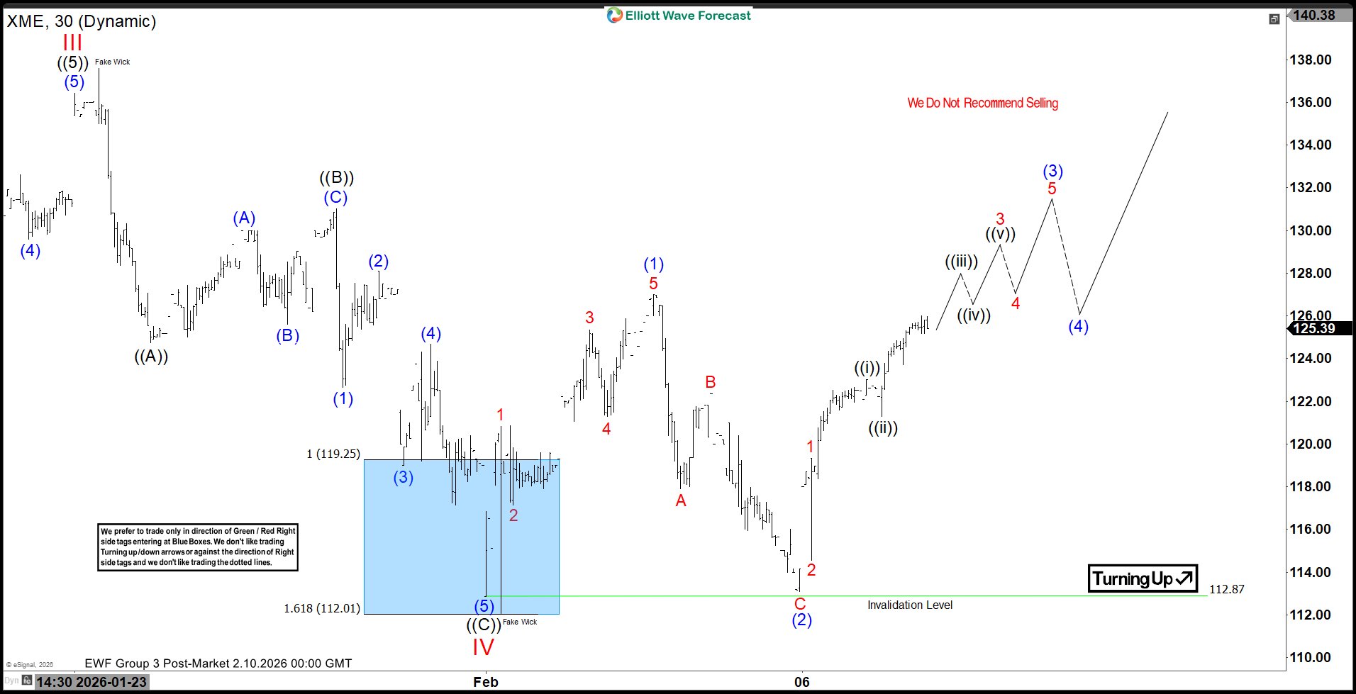 In the 1-hour Elliott Wave count from Jan 30, 2026, we saw that $XME completed a 5-wave impulsive cycle at blue (3). As expected, this initial wave prompted a pullback. We anticipated this pullback to unfold in 3 swings, likely finding buyers in the blue box area between $119.25 and $112.01.