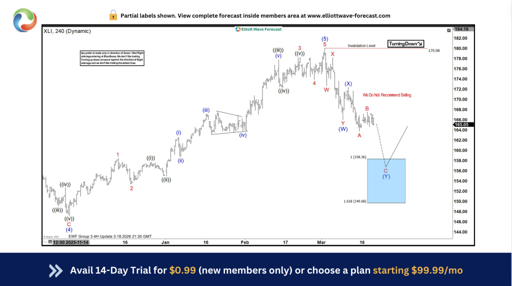 Industrial Select Sector SPDR Fund (XLI) ended the March 2026 pullback at the point where Elliott Wave Forecast Blue Box recommended members to go long. What’s next following this rebound?