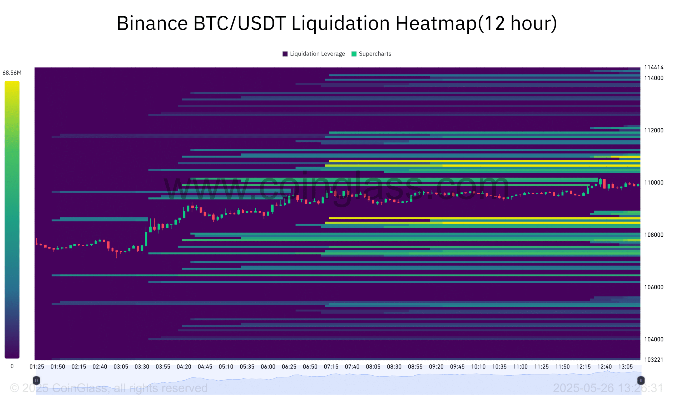 If demand cracks now, watch the 12-hour chart. There’s a juicy liquidity cluster at $108,478 with $68.57 million in leverage ready to get smoked.