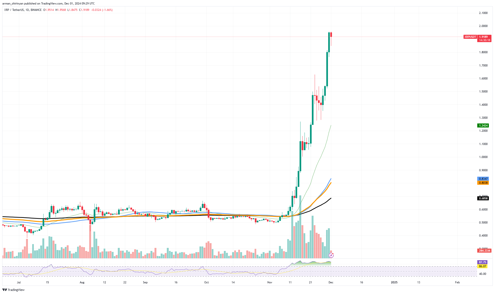 Due to its incredible ascent, XRP‘s price has risen to $1.95, bringing it closer to the psychological $2.00 mark and increasing its market capitalization to an incredible $110 billion. Due to the asset’s remarkable rally, investors are now speculating about two possible futures for it based on its current price action.