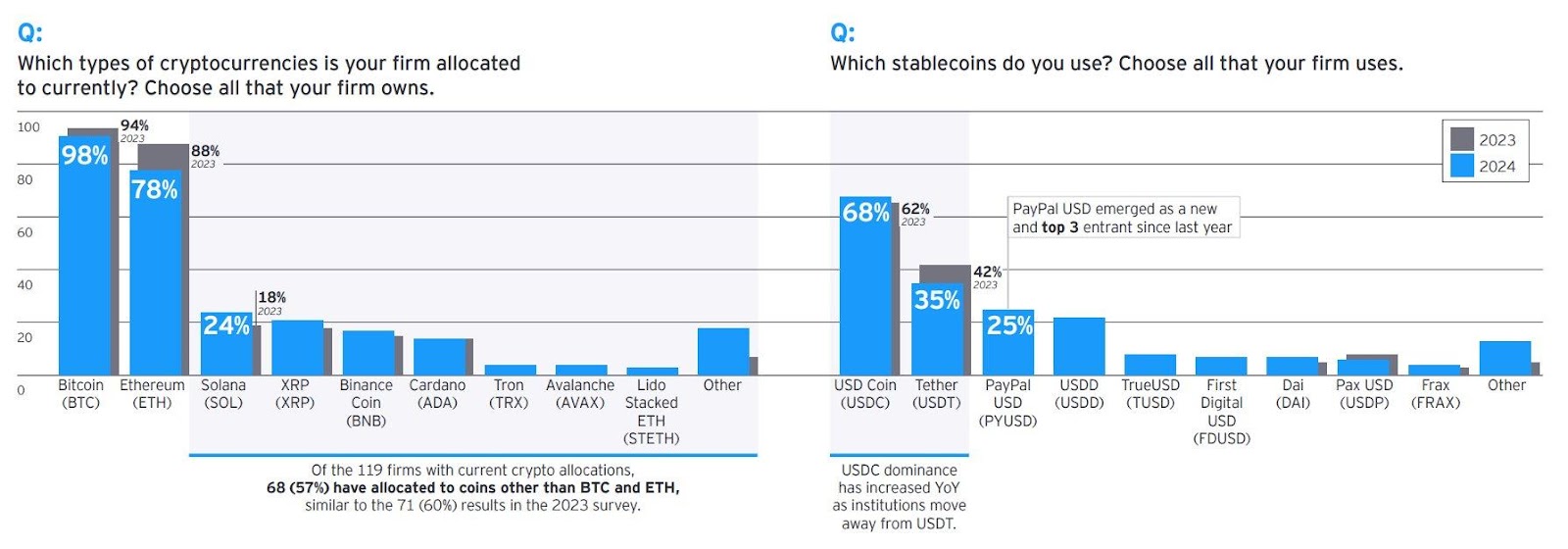 That said, among the various cryptocurrencies, Bitcoin and Ethereum dominate institutional portfolios, with 98% and 78% of respondents reporting allocations to the two assets consecutively. Solana follows with 24%, and XRP comes in at 20%.