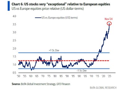 This chart shows how the returns on US stocks have blown out to absurd levels relative to European shares.