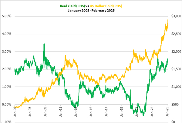When you look at the gold price cycle in the past, the long-term inflation adjusted yield of US Treasury bonds can influence the price of gold. They often move in opposite directions as you can see below: