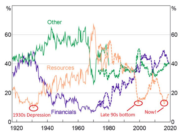 As you can see, the resource market’s weighting in the Aussie market (brown) has fluctuated wildly over the last century.