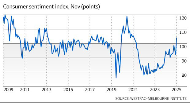 The latest Westpac-Melbourne survey surprised many, jumping 12.8% to 103.8 — its first positive reading in years.