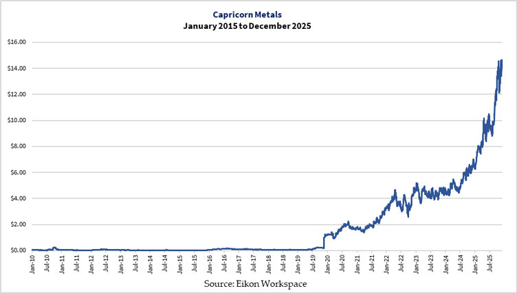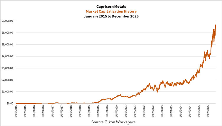 Smaller explorers and developers must create value by advancing their projects, expanding their portfolios, and bringing their mines into production Otherwise they risk diluting their shareholders to oblivion, become a takeover target, or go broke. However, several companies that are established producers now worth a several billion dollars were minnows worth less than $50 million in 2015. Capricorn Metals [ASX:CMM] (see chart below), Genesis Minerals [ASX:GMD], Greatland Resources [ASX:GGR], and West African Resources [ASX:WAF], for example.