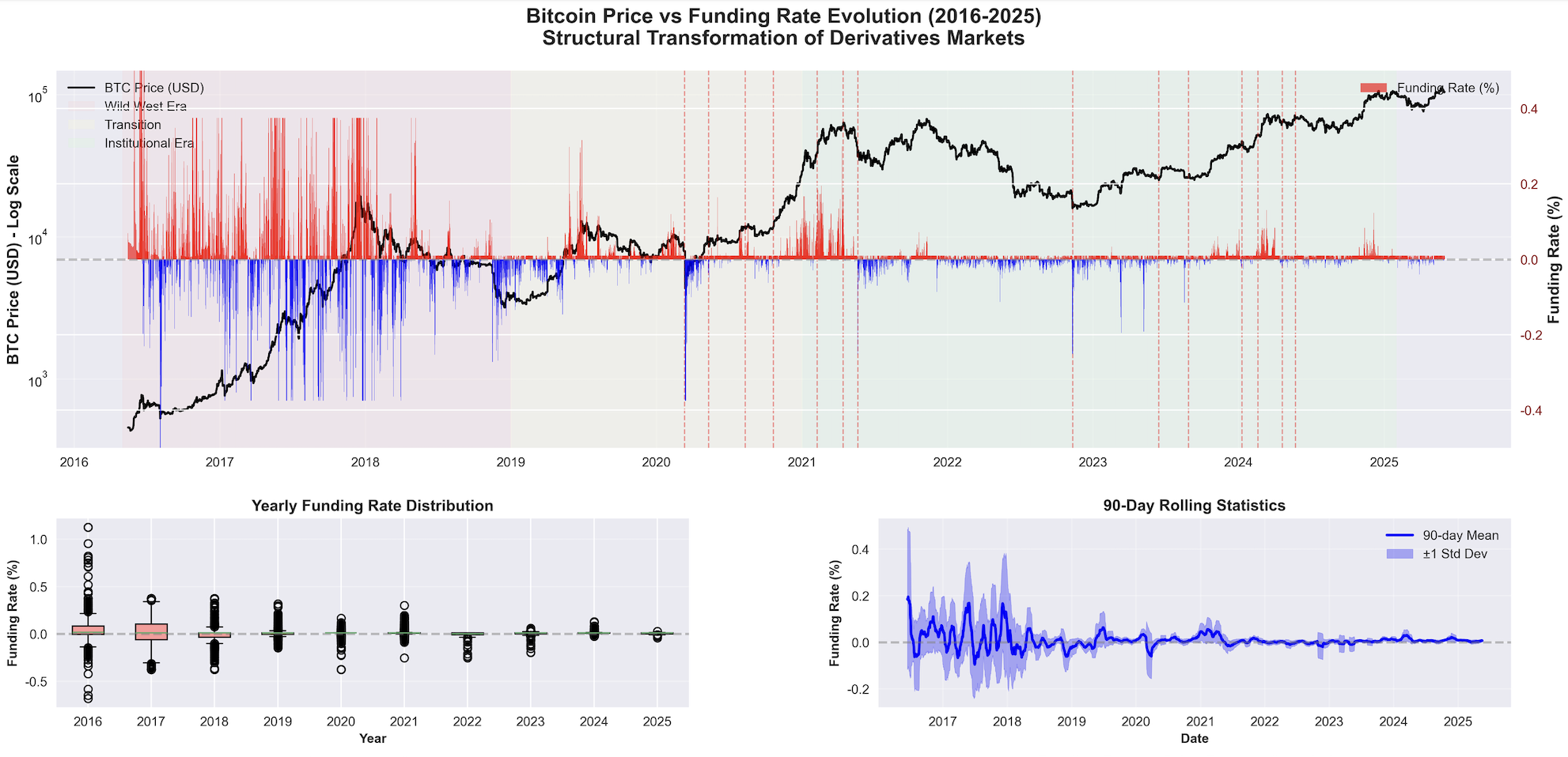 After nearly a decade of maturation, Bitcoin funding rates have evolved from speculative volatility to stable, institutional-grade market conditions. The data from XBTUSD funding rates from 2024 onward clearly demonstrates that the crypto derivatives market has transitioned from a speculative playground to a systematically efficient financial ecosystem.