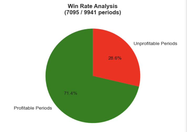 Figure 3 breaks down the risk-adjusted metrics that reveal why funding rate arbitrage achieved such impressive results. Out of the 9,941 funding periods, XBTUSD had a positive funding rate 71.4% of the time, meaning roughly 3 out of every 4 funding periods were profitable.