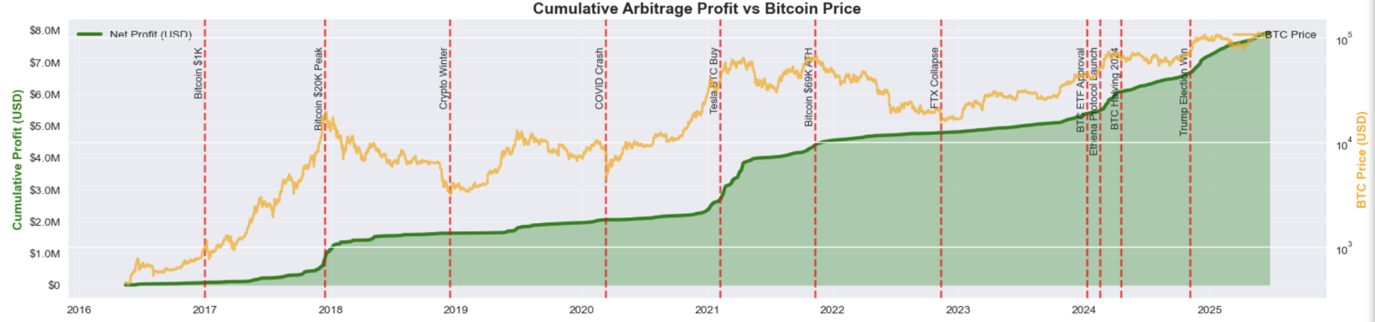 Figure 2 illustrates the cumulative profit comparison between funding rate arbitrage (green) and simple Bitcoin buy-and-hold (orange) from 2016 to present. While the market is often busy chasing Bitcoin’s drastic price swings, the opportunity that lay with funding rate arbitrage would have returned one of the best risk/reward profits. The strategy provided an extraordinary 873% annualised return, with a perfect track record—no losing years, no major drawdowns, just consistent profit accumulation that turned a modest six-figure investment into generational wealth.