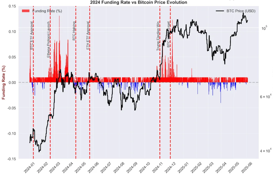 - 2017 Bull Run: Funding rates regularly exceeded 0.2%, with peaks above 0.3%