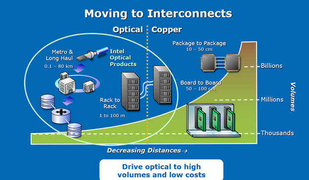At the dotted yellow line below, you can see the scale at which optics versus copper is used.