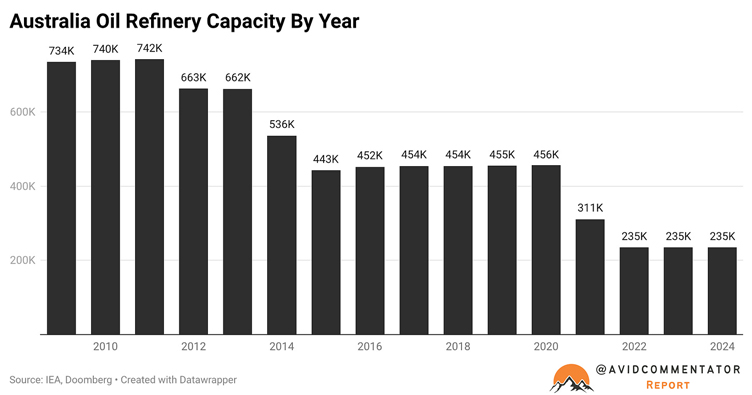 This is worth pausing on. Six domestic refineries have closed in the last 20 years. Australia now imports 90% of its liquid fuel needs.