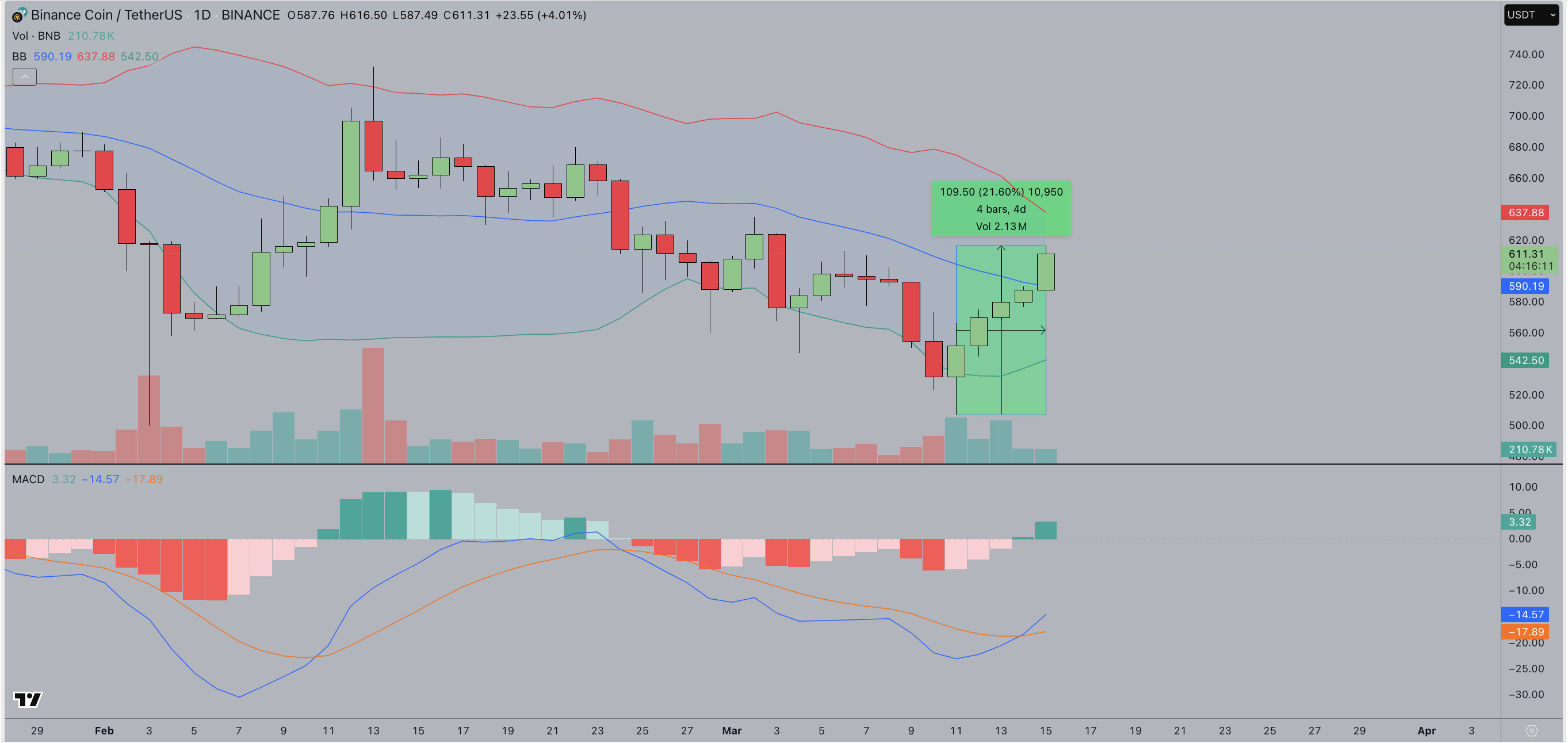 BNB price has surged 21.6% over the past four days, reclaiming key technical levels as bullish momentum strengthens. The price has decisively broken above the middle Bollinger Band (20-day moving average), currently at $590, signaling a shift in market structure. The upper Bollinger Band at $637 now serves as the next resistance, and a successful breakout could drive BNB toward the $650 level.