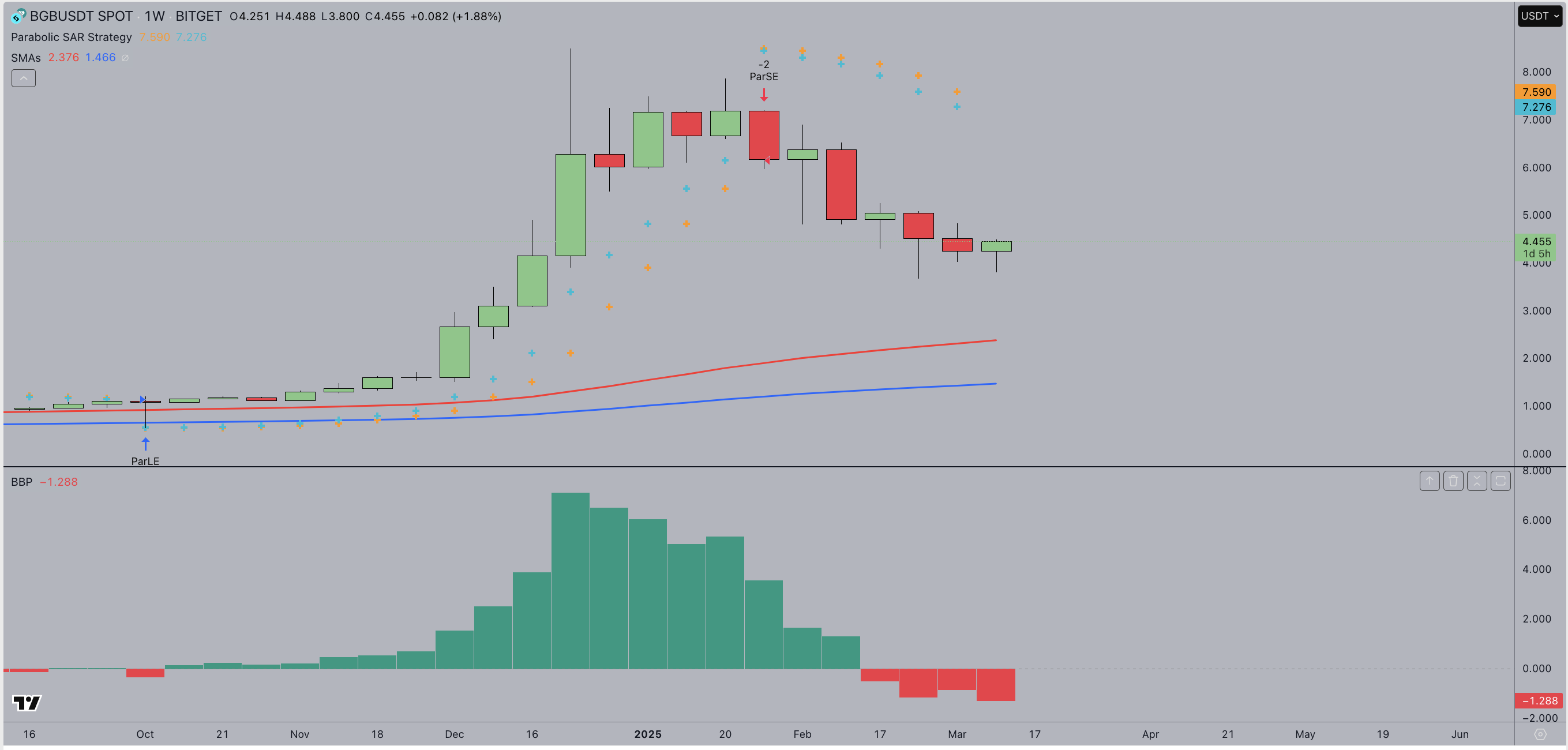 Currently trading at $4.455, BGB finds itself in a crucial zone where demand is beginning to resurface. The Bollinger Band Percentile (BBP) indicator has dipped into negative territory, reflecting the recent selling pressure, but this often signals an oversold condition that could pave the way for a recovery. If bulls can reclaim momentum, a breakout above $5 would open the door for a rally toward $6, aligning with prior resistance and the upper SAR targets.