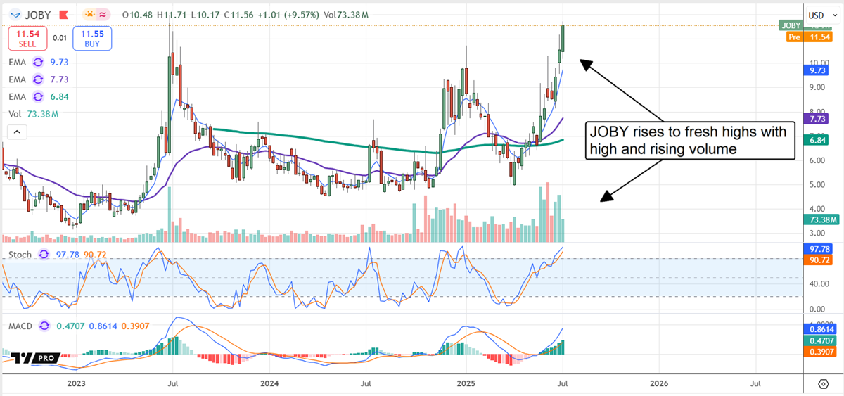 With attention focused on mega caps and AI, it’s easy to overlook riskier trades like small and mid-cap technologies. However, bullish activity in the charts of Amprius Technologies NYSE: AMPX, Joby Aviation NYSE: JOBY, and Ambarella NASDAQ: AMBA highlights the potential they offer. The activity of note includes increased volume, bullish swings in momentum, and price action that is setting new highs, confirming a reversal or bottom.