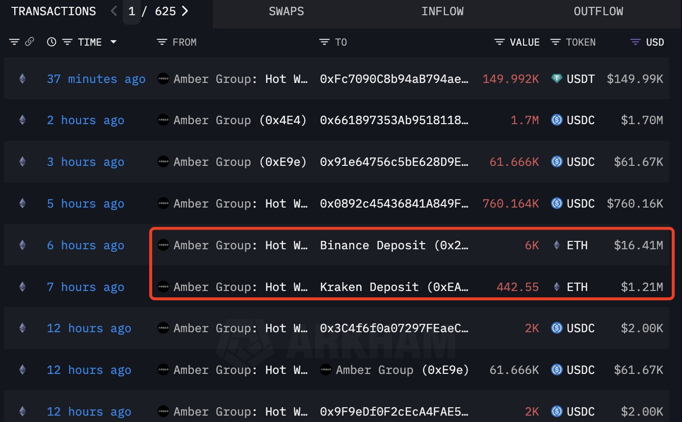 Over the past 24 hours, major players like Amber Group and Cumberland have deposited large amounts of ETH—6,443 and 6,439 ETH respectively—to exchanges that is Binance and Kraken.