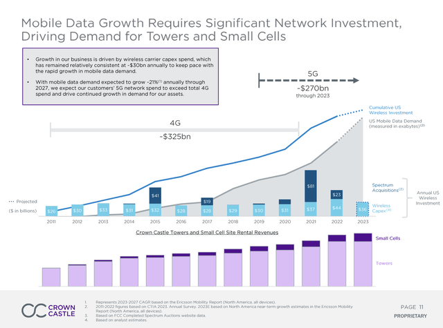 Due to the Internet of Things (an all-connected world), data demand has exploded, requiring billions in new infrastructure. Despite carriers’ focus on profitability, Crown Castle noted that the annual CapEx of major carriers has remained close to $30 billion per year, with 2023 CapEx coming in at $36 billion.
