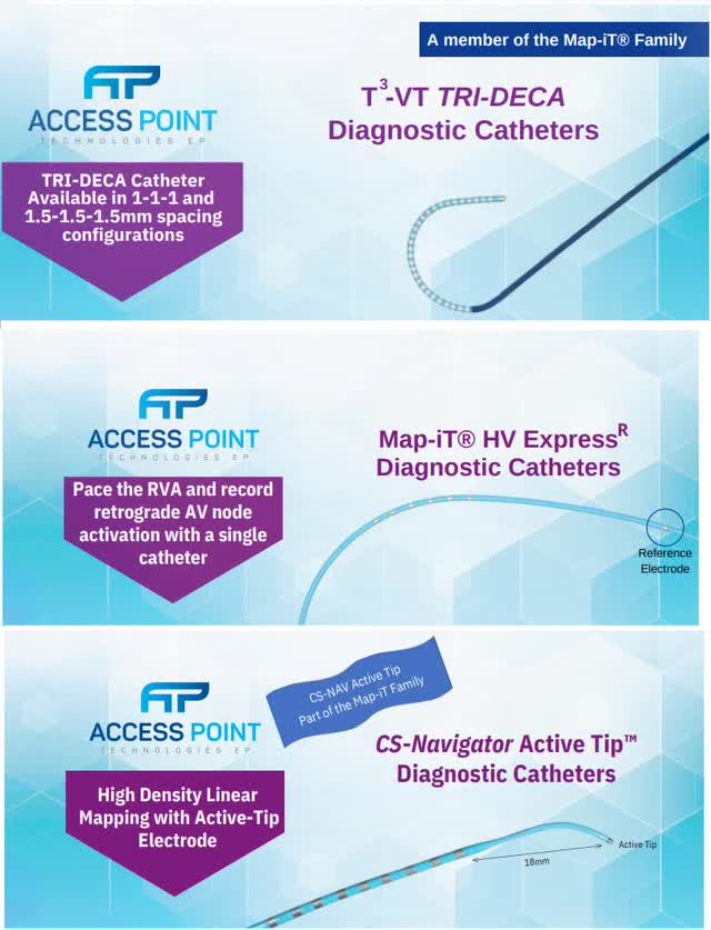 The 3 catheters below are the most differentiated devices in the firm’s lineup. The HV Express mapping catheter is used for pediatric patients; these are the patients star EP Dr. Sabine Ernst treats with robotics. The CS Navigator and T3 High Density mapping catheters are used to treat ventricular tachycardia. You can use the Access Point Technologies website to read the brochures which detail the technical specifics of these catheters.