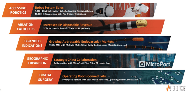 As the slide below shows, Stereotaxis has 5 parts to its innovation plan. They are the following: a more accessible robot, its own ablation catheter, a family of guidewires and guide catheters which expand the indications the robotic platform can be used for, a collaboration with MicroPort in China, and hardware & software products to conduct digital surgery. I wanted to share this slide because it shows an image of one of the semi-mobile robot’s arms in the in the top right along with the guide catheter and guidewire in the middle. The semi-mobile robot folds into itself when not in use to eliminate the need for magnetic shielding in the walls of the EP lab.