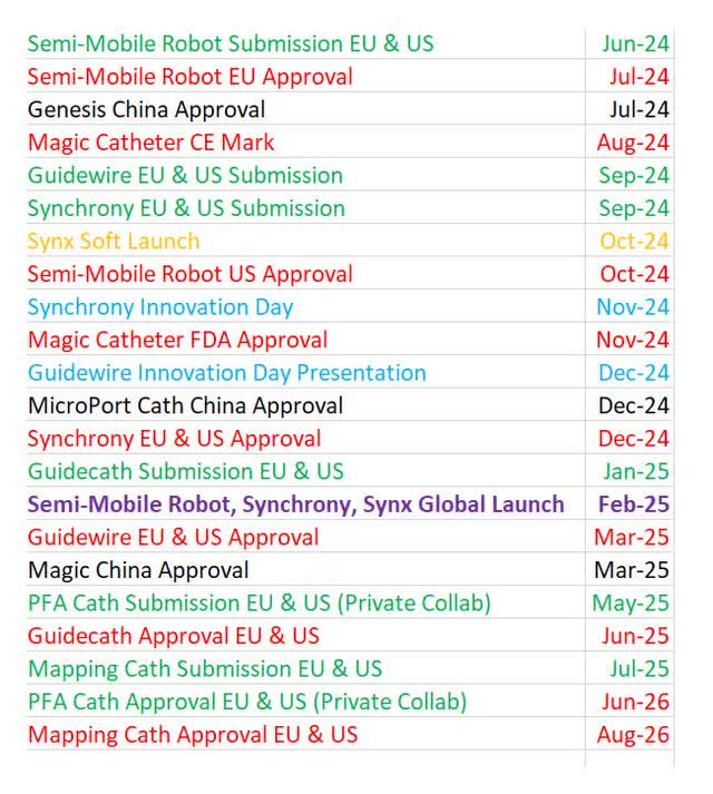 I made a color-coded list of all the potential catalysts for Stereotaxis in the next couple years. I like to put in specific months in my timeline to show how confident I am in a specific event. Instead of saying I’m very confident an event will happen in Q1, I’ll put January. Plus, it’s easier to organize which event will occur first if you go by months. Green is for regulatory submissions in the EU and US. Red is for regulatory approvals. Blue is for innovation days. Black is for China. Yellow is for software launches. Bolded purple is for the combined launch of the majority of its products.