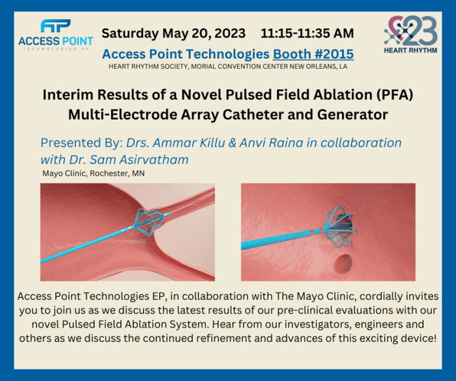 Stereotaxis CEO David Fischel believes PFA will first take market share from cryoablations over the next few years. Robotic magnetic precision, reach, and flexibility have the potential to make PFA catheters much safer and more effective. Two private companies are working on magnetic robotic PFA catheters. They have animal studies planned this summer. As you can see in the image below, Access Point collaborated with Mayo Clinic to show the pre-clinical results of their manual PFA catheter last year.