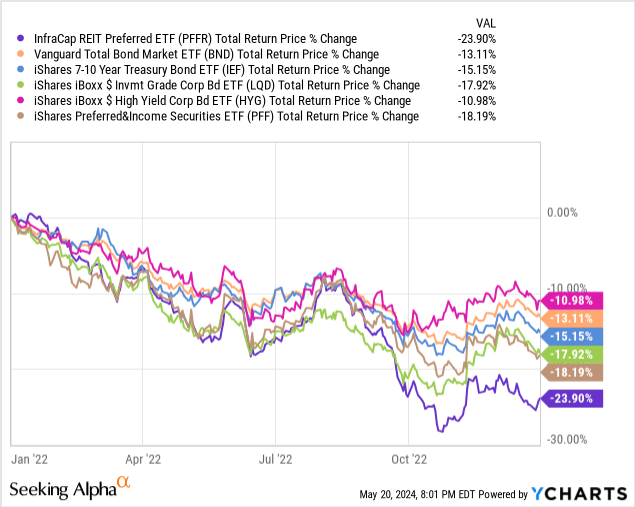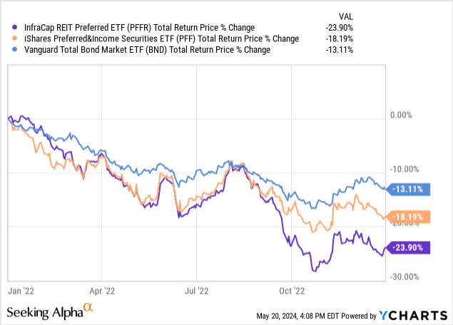 PFFR is an incredibly niche fund, investing in a subsegment, REITs, of a subsegment, preferred shares, of the fixed-income market. Due to this, diversification is quite low, and the fund’s performance could materially differ from that of broader bond or preferred indexes. Significant underperformance is possible. As an example, the fund posted significant losses and underperformance during 2022. Losses were due to a combination of higher rates leading to lower bond prices, and real estate industry weakness. Underperformance was mostly due to the latter.