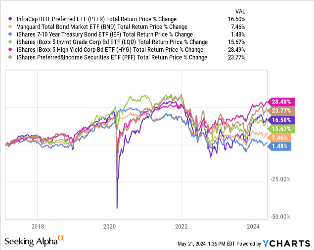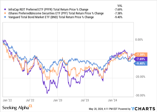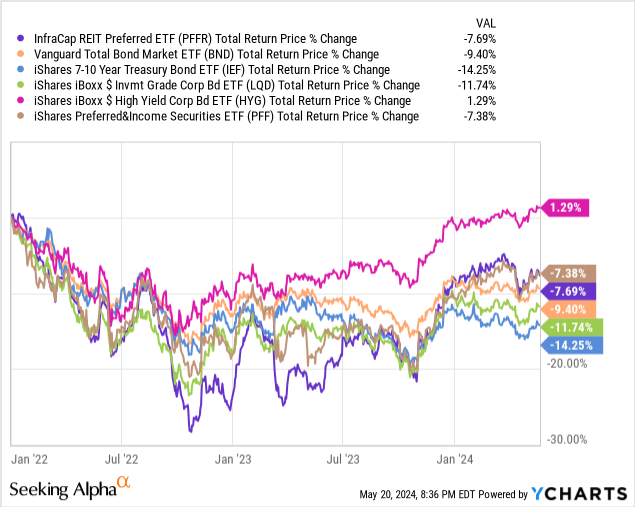 On a more positive note, PFFR has posted much stronger returns since, and the fund has actually slightly outperformed the average bond since 2022. It is still down though, same as most bonds.