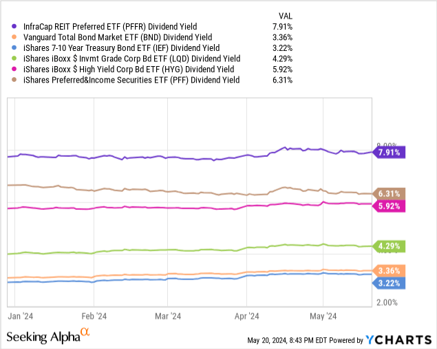 PFFR sports a 7.9% dividend yield, quite strong on an absolute basis, and higher than that of most bonds and bond sub-asset classes, including most other preferred shares and high-yield corporate bonds (there are exceptions).