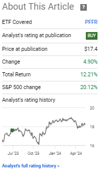 As a final point, I wrote a similar bullish article on PFFR in mid-2023. The fund has performed quite well since, seeing double-digit annual returns. Not too bad for a preferred shares ETF.