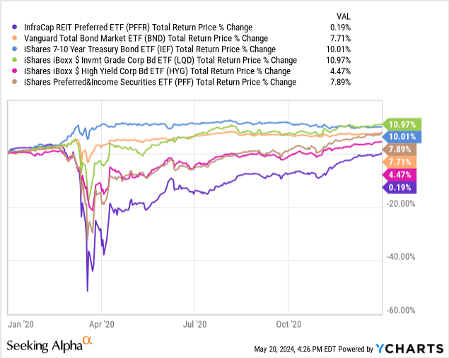 Due to the above, expect significant, above-average losses during downturns and recessions. As an example, the fund suffered a 50% drawdown during early 2020, the onset of the coronavirus pandemic. Losses were much higher than most bonds and bond sub-asset classes, including (broader) preferred shares. PFFR did start to recover by late March but remained behind its peers by year’s end.