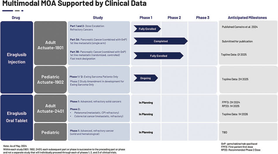 Its pancreatic cancer program is the most advanced, having completed Phase 1/2 trials, and management is pursuing testing of treatment for Ewing sarcoma as part of its Actuate-1902 Phase 1/2 study in pediatric refractory malignancies.