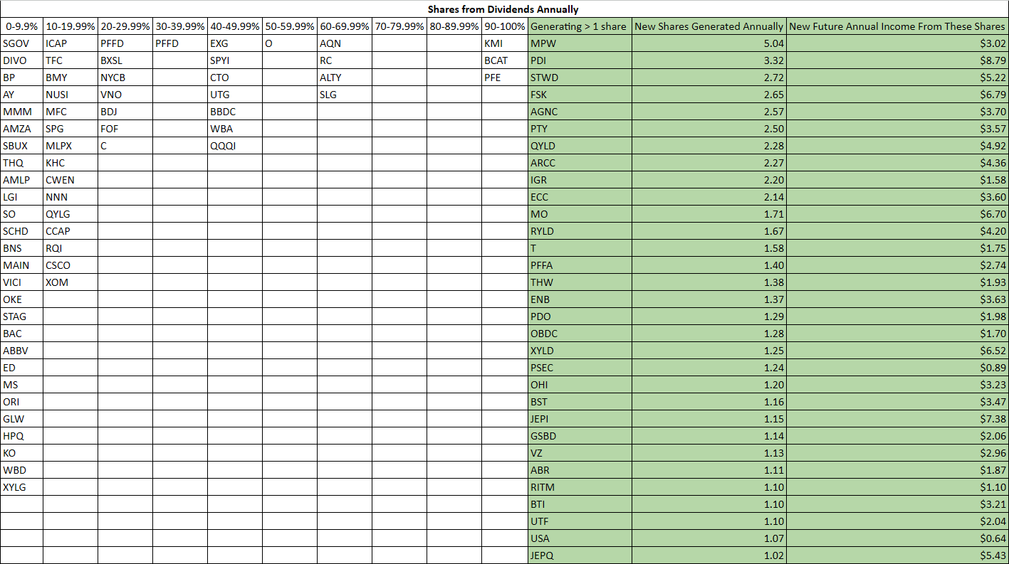 This is getting a bit annoying as Kinder Morgan (KMI) fell back into the 90-100% column for companies that are producing one share annually from their dividends. The goal is to have as many companies in the green sector of the table below as possible. There are now 3 positions tittering on the edge and a bunch of positions generating between 40-70% of their share price from their dividends. Currently, 31 positions are generating at least 1 share of their dividend income. The new shares they are producing are adding roughly $110.95 of new dividend income to the Dividend Harvesting Portfolio. Eventually, I would like every position in the green section, but that’s going to take a lot of time. For now, I will continue knocking this objective out 1 company at a time.