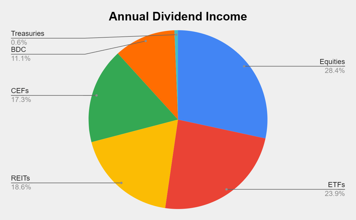 Individual equities now represent 38.56% of the Dividend Harvesting portfolio while generating 28.38% of the dividend income. REITs, ETFs, CEFs, and BDCs make up 61.44% of the portfolio and generate 71.62% of the forward income. I plan on adding to every asset class within the Dividend Harvesting Portfolio throughout 2024, but in the early stages, I will try to divert capital away from REITs in the short term.