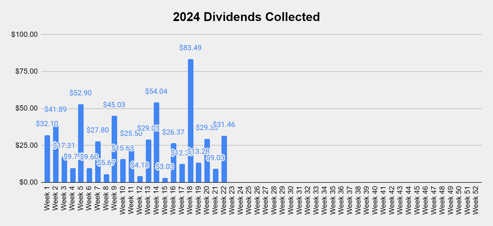Collecting dividends can serve many functions in a portfolio. Some investors utilize dividends to supplement their income and live off of them. I’m building a dividend portfolio for myself 30 years into the future. In 2022, I collected $507.80 in dividend income from 533 dividends. In 2023, I collected $978.11 in dividend income from 660 dividends. After the first 22 weeks in 2024, I have collected $578.81 from 295 dividends. This is 59.30% of the total dividend income generated in 2023 from 44.70% of the dividends produced.