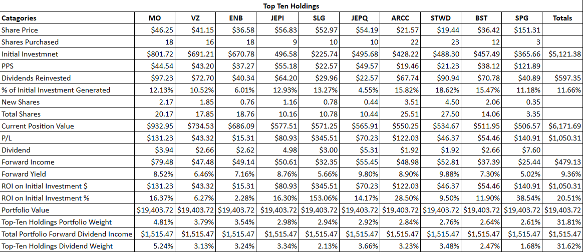 As the positions haven’t changed, the allocation to the top-10 positions remains at $5,121.38. They are now worth $6,171.69, which is an ROI of $1,050.31 (20.51%). There has been $597.35 of dividends generated and reinvested, which is 11.66% of the initial invested capital into this group of positions. I am now projecting that $479.13 of dividend income will be generated from the top 10 holdings, which have a forward yield of 9.36%. These positions represent 31.81% of the portfolio, while their forward dividend income is projected to generate 31.62% of the Dividend Harvesting Portfolio’s annualized income.