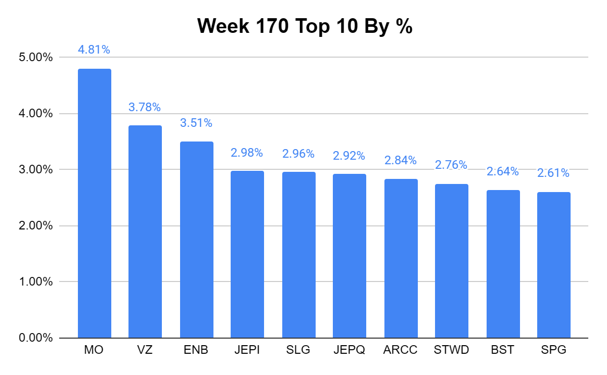The beauty of diversification is that even if the market goes down, there are positions within your portfolio that will go up. This is exactly what occurred in week 170 as the markets went down, but the Dividend Harvesting Portfolio’s profitability grew 1.45% week over week. This portfolio is being built for income as I want to generate more than the risk-free rate of return and to mitigate downside risk. This week is a testament to how a diverse portfolio can help stabilize market conditions. Capital appreciation is a secondary objective, as I am not interested in beating or replicating the market’s annualized returns. No matter what happens, I will continue to allocate capital toward the Dividend Harvesting Portfolio, and if the Fed gets hawkish again and REITs decline, I plan on focusing on Realty Income (O) VICI Properties (VICI) and some others over the next several weeks.